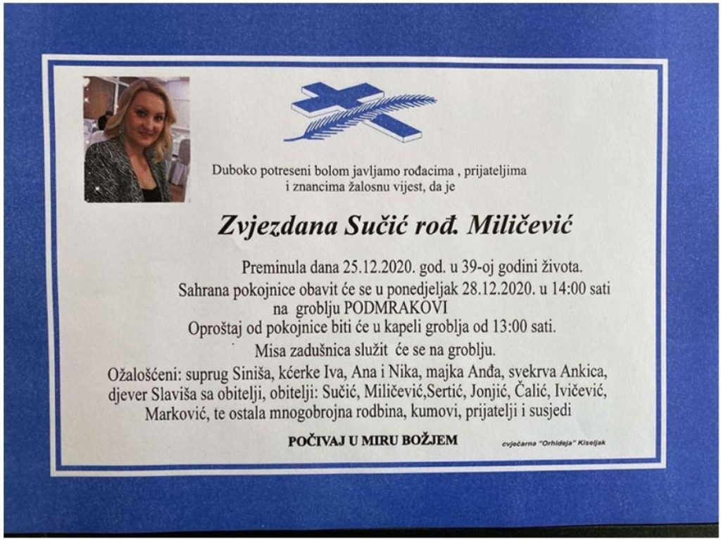 Još jedna tužna vijest potresla je Bosnu i Hercegovinu. U 39. godini preminula je Zvjezdana Sučić, porodilja iz Kiseljaka. Društvenim mrežama, pa i na našem portalu širio se apel za potrebne donacije krvi, no, Zvjezdana nije izdržala. Iza sebe je ostavila supruga Sinišu i tri kćerke: Ivu, Anu i Niku. Sahrana mladoj majci je održana jučer u 14 sati na groblju Podmrakovi u Kiseljaku. RadioSarajevo.ba je kjontaktiralo i Kantonalnu bolnicu Zenica. Iz ove ustanove je potvrđeno da je porodilja preminula 25. decembra od posljedica upalnih promjena u trbuhu.