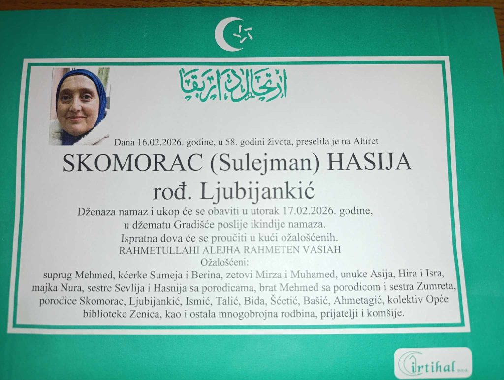 Gradska biblioteka Zenica obavijestila je javnost da je preminula njihova dugogodišnja kolegica Hasija Skomorac.