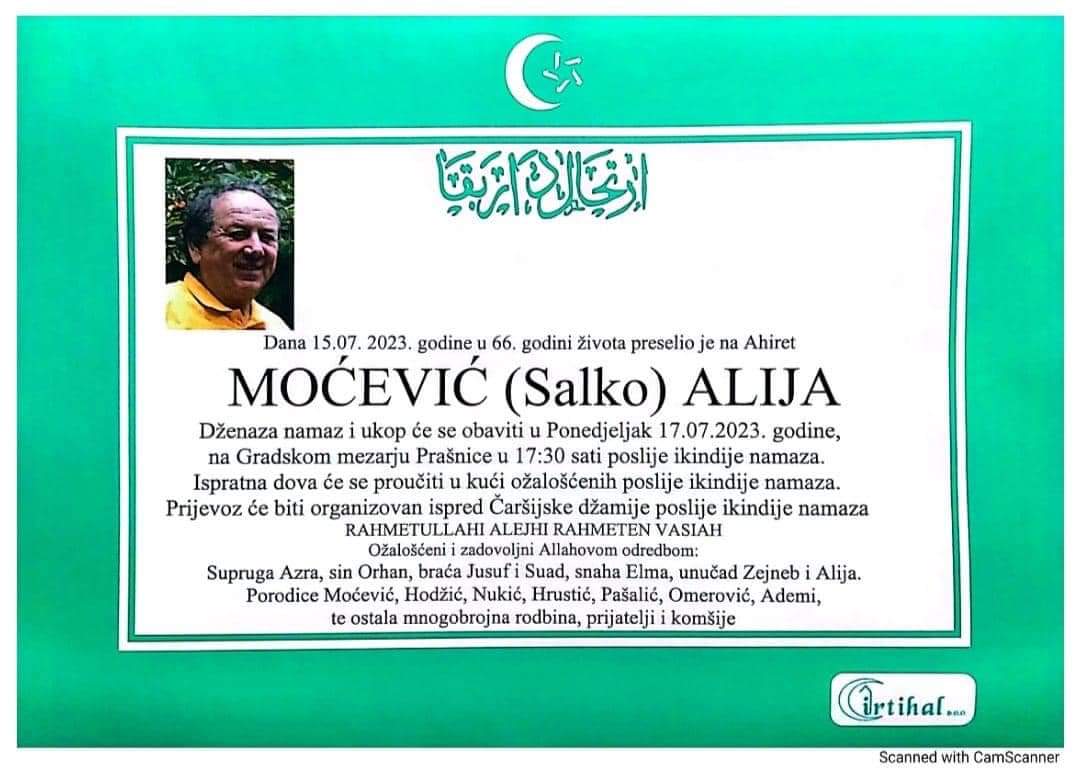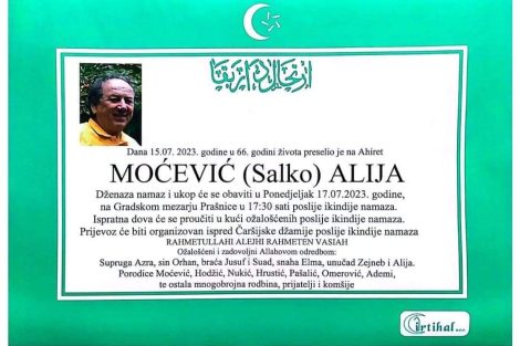 Dženaza je planirana u ponedjeljak poslije ikindije-namaza, u 17.30 sati, na Prašnicama.