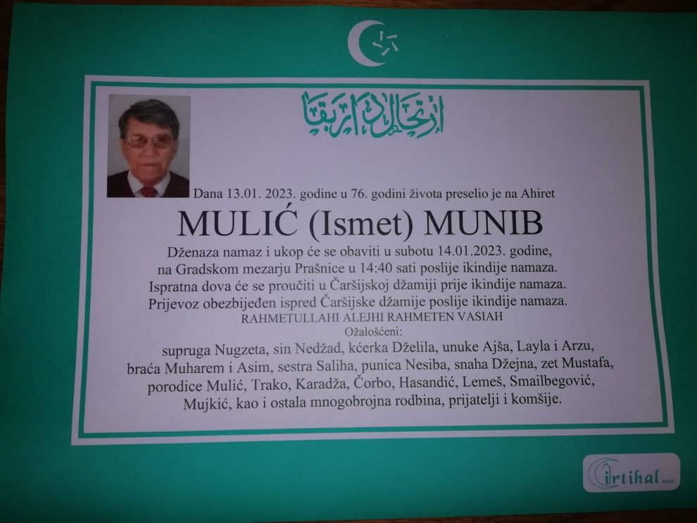 Jutros je u Zenici preminuo prim.dr. Munib Mulić, penzionirani specijalista pedijatrije, dugogodišnji stručnjak Kantonalne bolnice Zenica, gdje proveo veći dio svog radnog vijeka. Potom je radio i u “Medicomu”.