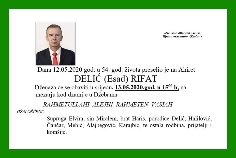 Dženaza-namaz Rifetu Deliću bit će klanjana sutra, 13. maja u 15.00 sati na mezarju kod džamije u Džebama, općina Zavidovići gdje će biti i ukopan.