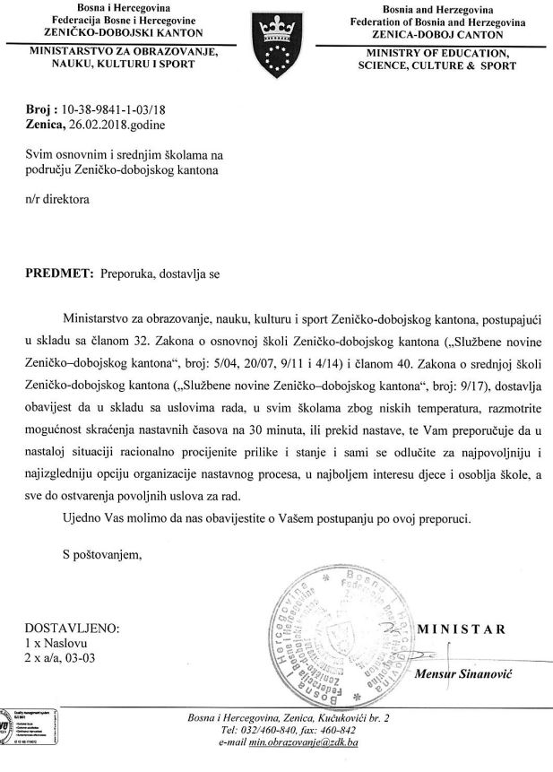 Preporuka ministarstva: skraćivanje na 30 minuta ili prekid nastave – Ministarstvo za obrazovanje Zeničko – dobojskog kantona jutros je izdalo Preporuku školama u vezi sa eventualnim skraćivanjem ili prekidom nastave. Preporuku pročitajte u nastavku: