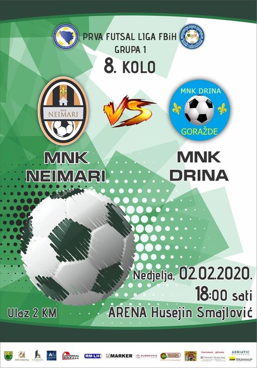 Utakmica MNK Neimari – KMF Drina igra se ove nedjelje. 02.2. 2020.godine u gradskoj Areni „Husejin Smajlović“ u 18 sati, ulaz je dvije KM.