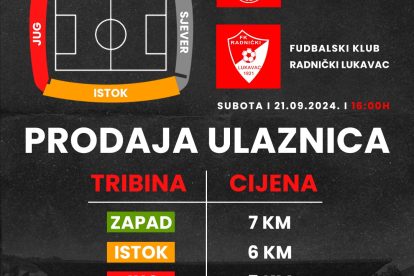 Ulaznice za utakmicu možete kupiti u: Caffe Bonobo,  Caffe Avanti, Caffe Šibica i „Orijent“. Cijene ulaznica: Zapad 7 KM, istok 6 KM, jug 5 KM.