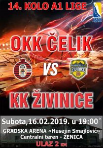 Utakmica OKK Čelik – KK Živinice na rasporedu je u subotu 16.2.2019.godine u gradskoj Areni „Husejin Smajlović“ u Zenici na centralnom terenu, sa početkom u 19 sati.