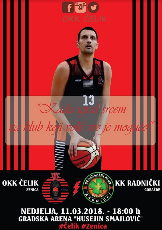 Da ponovimo, utakmica OKK Čelik – KK Radnički na rasporedu je u nedjelju 11.marta 2018.godine u gradskoj Areni „Husejin Smajlović“ u Zenici na centralnom terenu, sa početkom u 18,00 sati. Ulaz 2 KM.