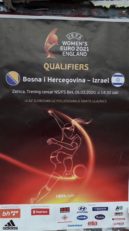 Press ženske nogometne reprezentacije BiH Sutra, četvrtak 05.marta 2020.godine, u Zenici se igra šesta kvalifikacijska utakmica ženske bh. reprezentacije, BiH – Izrael (14:30 sati) za Evropsko prvenstvo 2021.godine. Utakmica se igra na glavnom terenu stadiona Trening centra N/FSBiH, koji se nalazi na crkvičkom brdu. Ulaz za gledaoce je slobodan uz gratis ulaznicu.