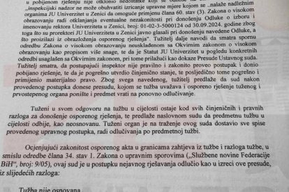 Kantonalni sud u Zenici, sutkinja Ranka Baškarad, kao sudija pojedinac, u upravnom sporu tužitelja Javne ustanove Univerzitet Zenica, protiv rješenja tuženog Ministarstva za obrazovanje, nauku, kulturu i sport Zeničko-dobojskog kantona, u upravi inspekcijskog nadzora, donio je presudu kojom se tužba odbija kao neosnovana, saznaje Zenicablog.