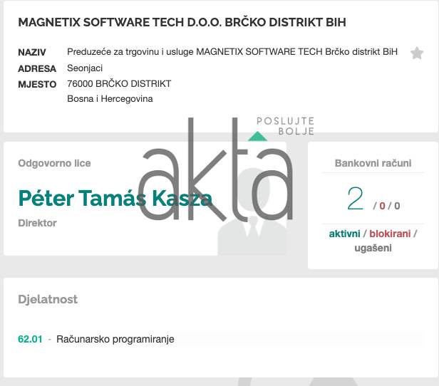 Firma je zvanično registrovana 31.05.2023. kao MAGNETIX SOFTWARE TECH D.O.O. u Brčko distriktu. Početni kapital je 100 KM. Odgovorno lice je Péter Tamás Kasza. Finansije za ovu firmu nisu dostupne.