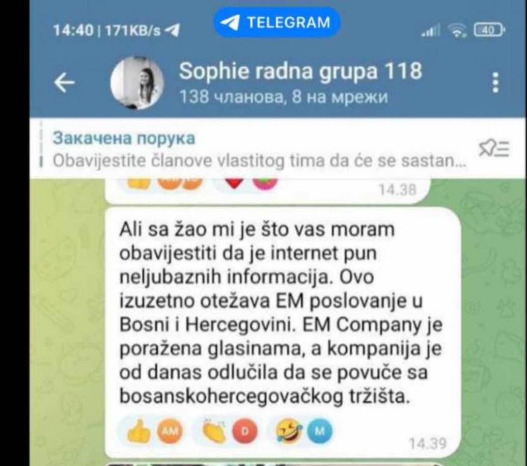 “Žao mi je što vas moram obavijestiti da je internet pun neljubaznih informacija. Ovo izuzetno otežava EM poslovanje u BiH. EM je poražena glasinama, a kompanija je od danas odlučila da se povuče sa bosanskohercegovačkog tržišta.”, navodi se u Sophie radnoj grupi.