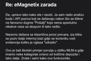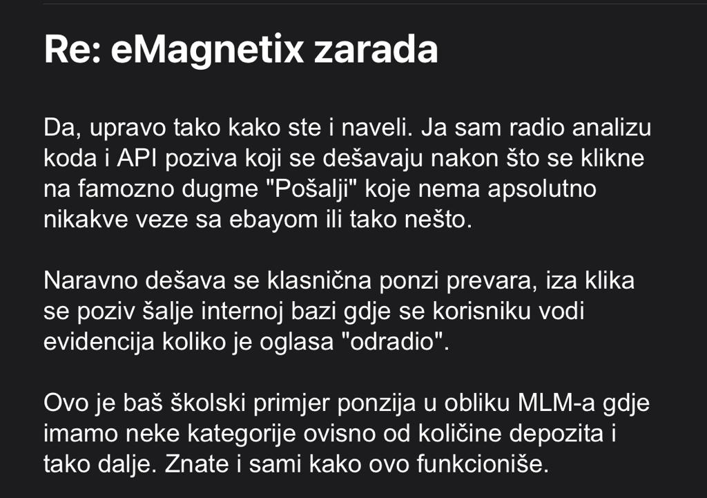 Pokušali smo kontaktirati i firmu eMagnetix iz Brčkog, ali nismo uspjeli naći nikakav kontakt. Ono što je dosta zbunjujuće jeste i sam naziv firme, jer postoji i druga legalna firma u Austriji koja se bavi marketingom. No, bez obzira na naziv i legitimnost svako od nas bi prije bilo kakvog ulaganja u neki posao trebao dobro istražiti o kome se radi.