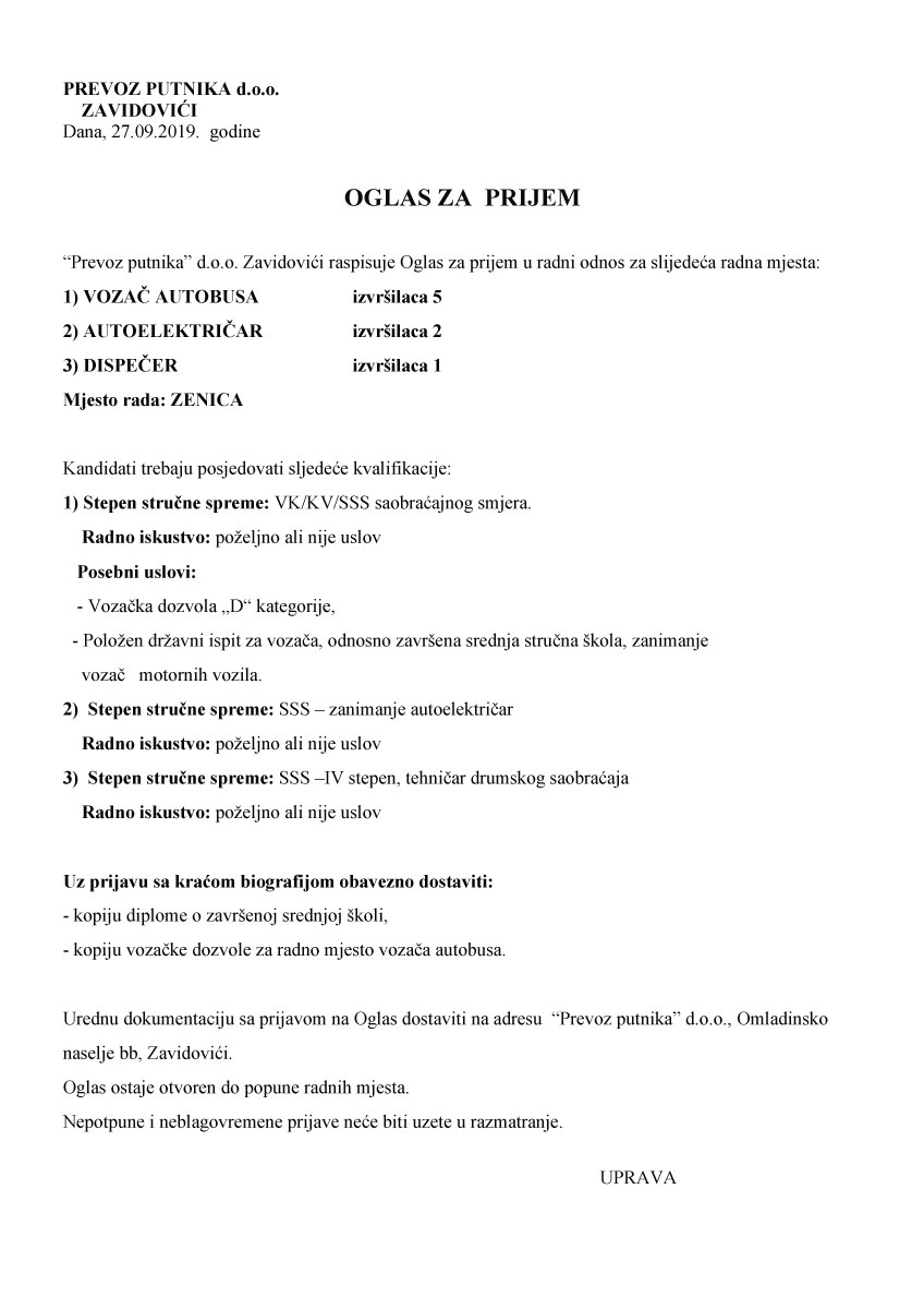 OGLAS ZA PRIJEM U RADNI ODNOS — “Prevoz putnika” d.o.o. Zavidovići raspisuje Oglas za prijem u radni odnos za slijedeća radna mjesta: