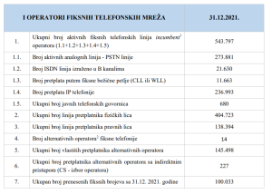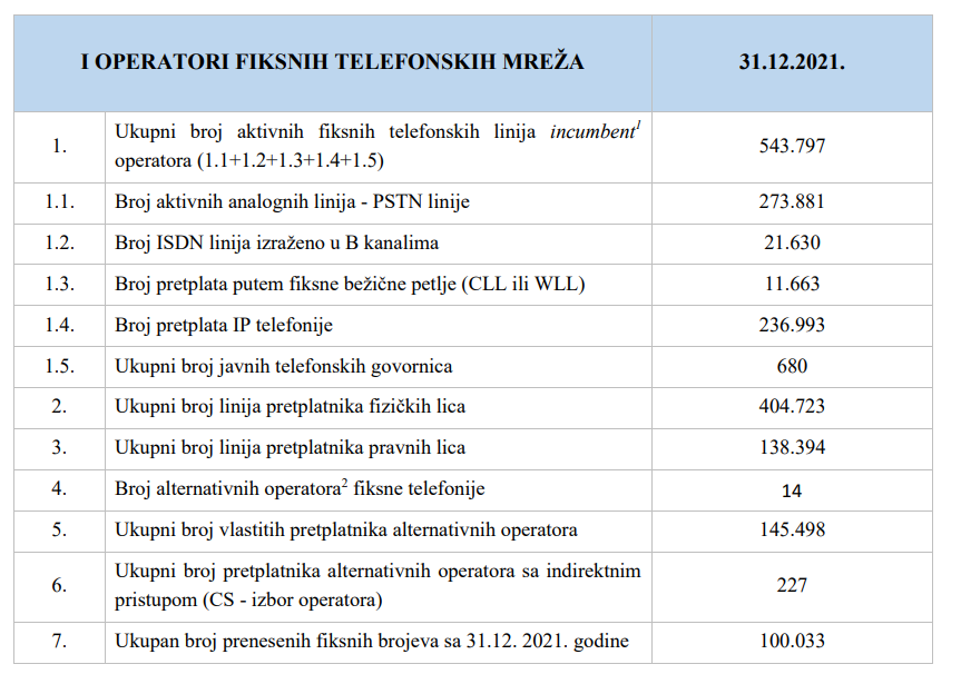 Ukupni broj aktivnih fiksnih telefonskih linija incumbent operatora je 543.797 i u odnosu na 2020. je u padu kada ih je bilo 560.796.