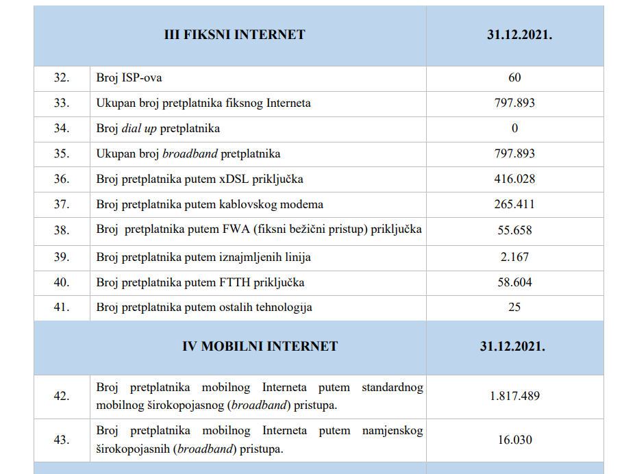 Kada je fiksni internet u pitanju na dan 31.12.2021. broj ISP-ova je 60, broj pretplatnika fiksnog Interneta 797.893, ukupan broj broadband pretplatnika je 797.893 dok je broj pretplatnika putem xDSL priključka 416.028 a putem kablovskog modema 265.411.