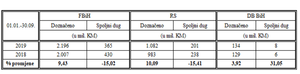 U tablici ispod dajemo prikaz ukupno raspoređenih sredstava entitetima i Distriktu Brčko BiH sa pripadajućim spoljnim dugom za period januar – septembar 2019. godine u poređenju sa istim periodom prošle godine. Svi iznosi su iskazani u milionima KM.