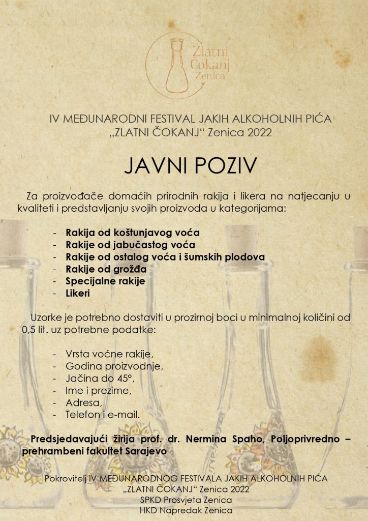 U subotu 12.02.2022 godine u Sokolskom domu – Staro Pozorište u Zenici sa početkom u 17h održat će se proglašenje pobjednika i svečana dodjela priznanja IV MEĐUNARODNI FESTIVAL JAKIH ALKOHOLNIH PIĆZLATNI ČOKANJ“ Zenica 2022