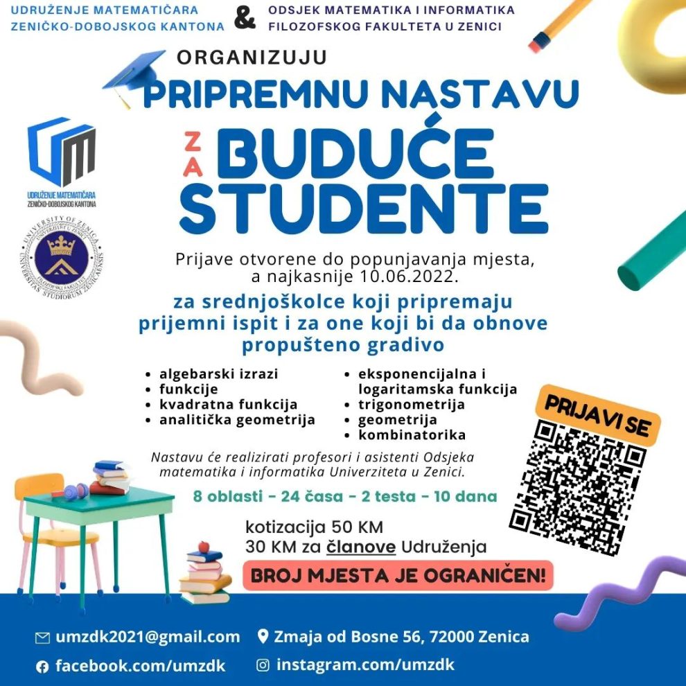 Udruženje matematičara Zeničko-dobojskog kanton u saradnji sa Odsjekom matematika i informatika Univerziteta u Zenici organizuje pripremnu nastavu iz matematike za buduće studente. 🎓