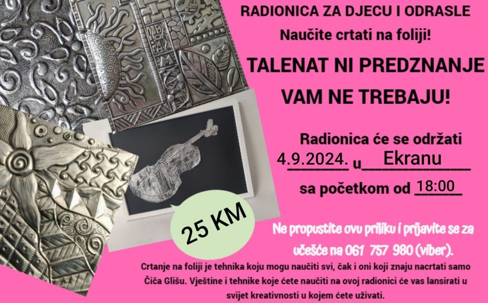 Radionica je za djecu i odrasle, te je za učešće neophodna prijava na 061 757 980 (viber)