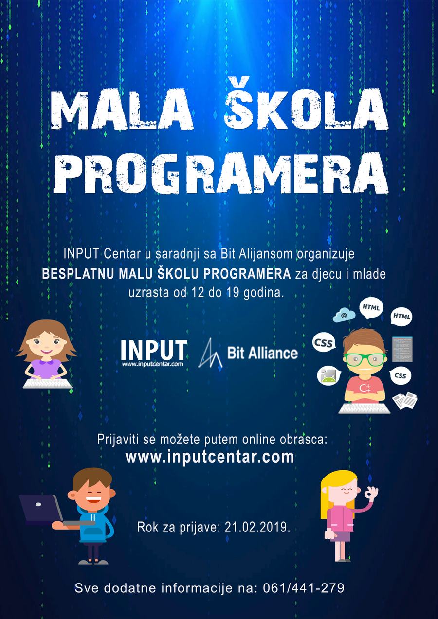 U INPUT-u su odlučili pokrenuti “MALU ŠKOLU PROGRAMERA” za djecu i mlade uzrasta od 12 do 19 godina. U ovoj edukaciji podršku im pruža i Bit Alijansa udruženje koje broji 55 najvećih IT kompanija. Cilj je zainteresovati i edukovati djecu i mlade da kroz igru i zabavu otkriju svijet programiranja web stranica (HTML i CSS).