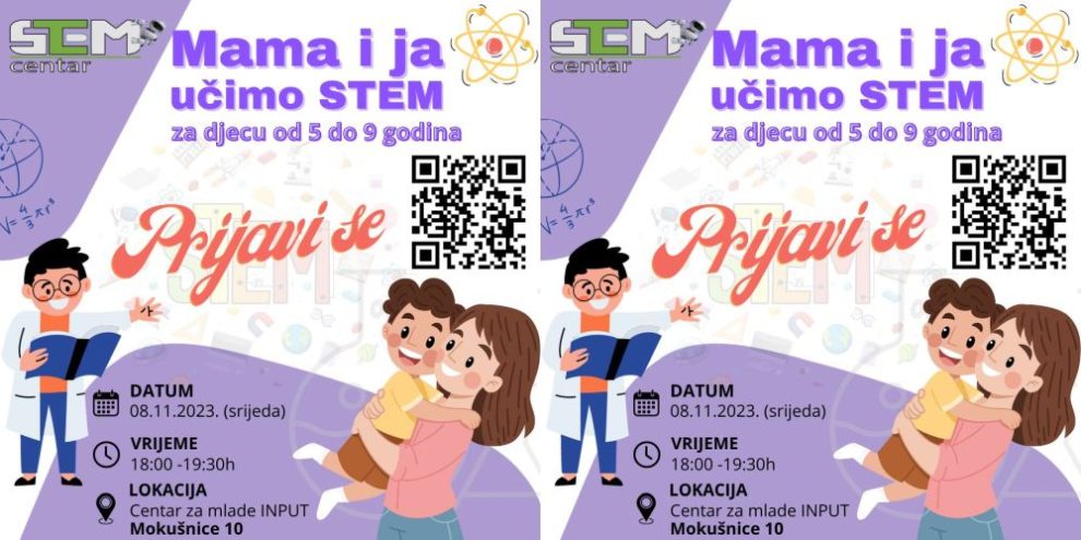 STEM Centar u okviru Međunarodnog dana STEM-a organizuje radionicu ” č ” koja je namjenjena djeci starosne dobi od 5 do 9 godina i njihovima mamama.