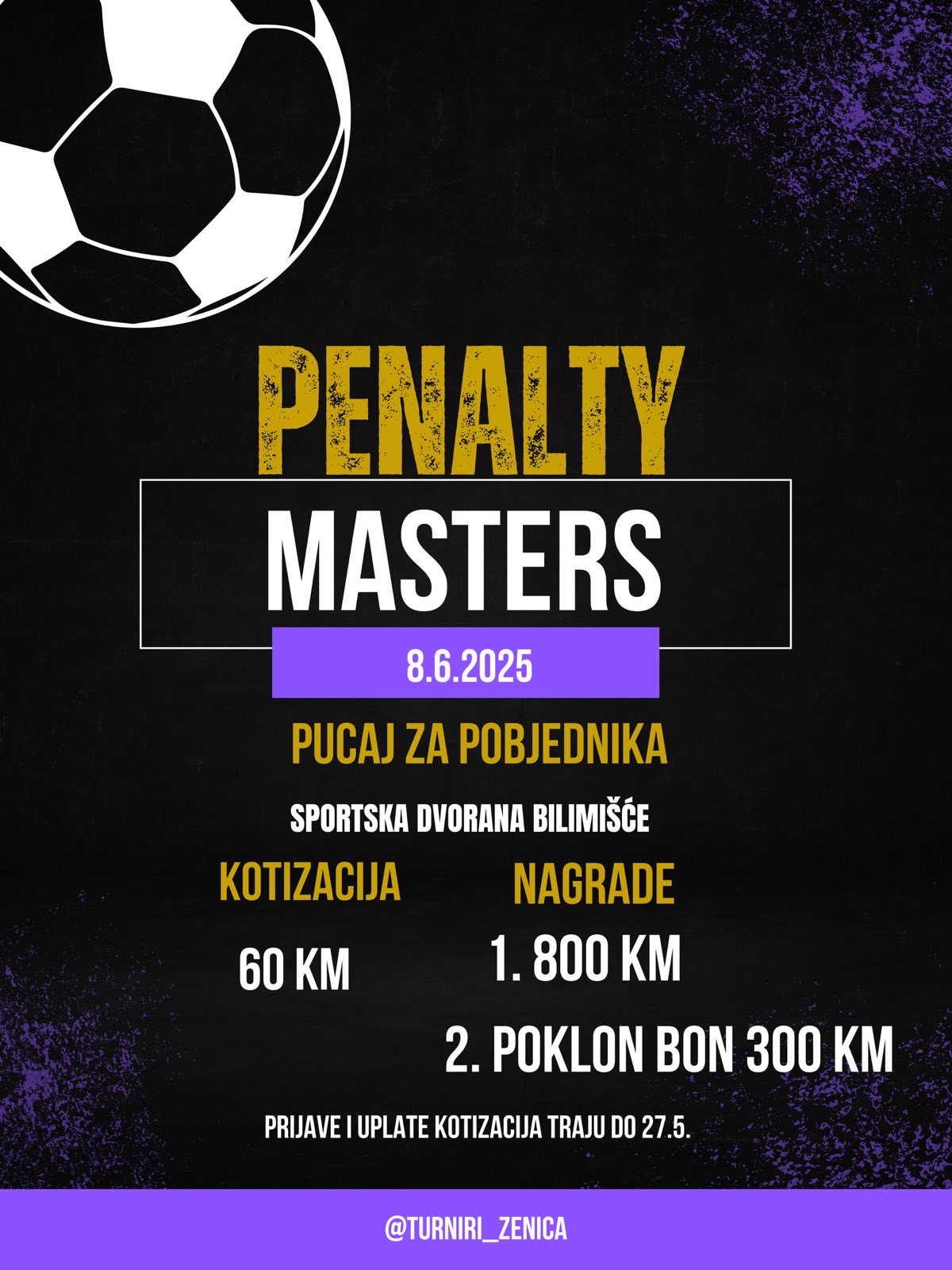 Ovo je do sada neviđeno! Mladi organizatori iz Zenice, Anel Kobić i Amar Bandić , su svojim trudom i entuzijazmom uspjeli da organizuju prvo takmičenje u penalima pod imenom “Penalty Masters” u Bosni i Hercegovini! Ovaj inovativni događaj, koji se održava u sportskoj dvorani Bilimišće, predstavlja značajan korak naprijed u promociji sporta i okupljanju mladih talentovanih fudbalera.