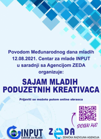 Prijavite se za učešće na sajmu “Mladih poduzetnih kreativaca”- Centar za mlade INPUT u saradnji sa Agencijom ZEDA, u okviru obilježavanja Međunarodnog dana mladih 12.08.2021. godine, organizuje sajam „Mladi poduzetni kreativci“.