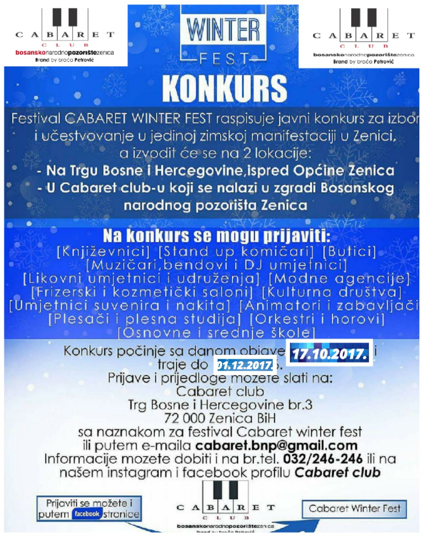 CABARET WINTER FEST predstavlja jedini zimski festival u Gradu Zenici, te kao takav ima za cilj oživjeti zimsku čaroliju I građanima ponuditi zanimljiv sadržaj u hladnim zimskim dana. Ideja o pokretanju CABARET WINTER FEST-a javila se 2013. godine, kada je prvi put organiziran ovaj festival, ali tada pod nazivom “Snježna kraljica-Zenica 2013.”
