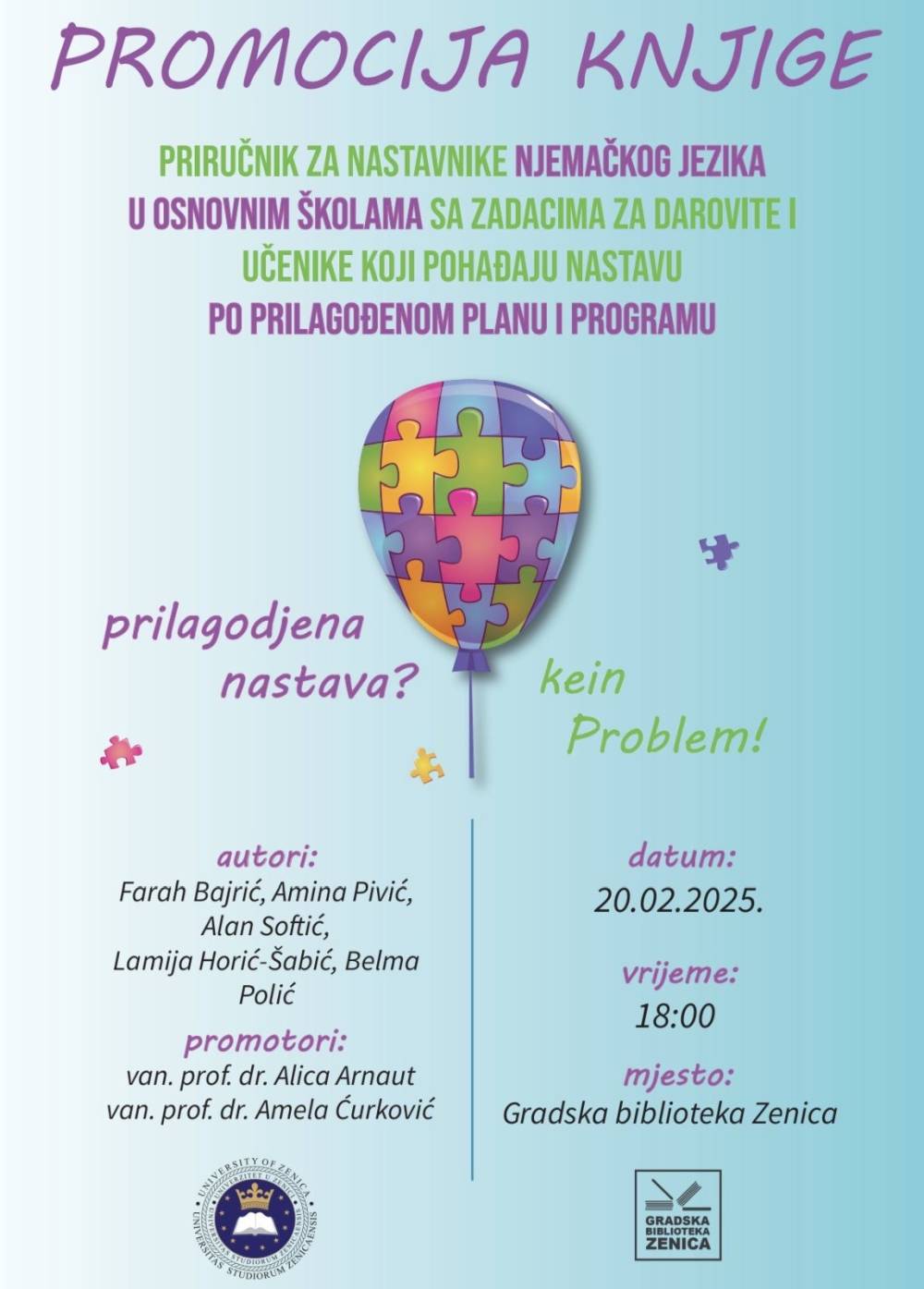 U četvrtak, 20. februara u 18:00, u Gradskoj biblioteci u Zenici održat će se promocija Priručnika za nastavnike njemačkog jezika sa zadacima za darovite učenike i one koji rade po prilagođenom planu i programu.