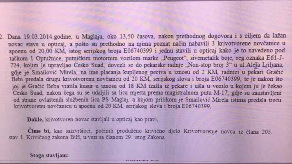 “Dana 19. marta 2014. godine, u Maglaju, s ciljem da se lažan novac stavi u opticaj, Mirela Smajlović i Suad Ćesko dovezli su se do pekarske radnje “Non-stop broj 3” gdje su predali krivotvorenu novčanicu od 20 KM na ime plaćanja kupljenog peciva od 2 KM”, piše u obrazloženju prijedloga za određivanje pritvora koji je krajem prošle sedmice upućen Sudu BiH.