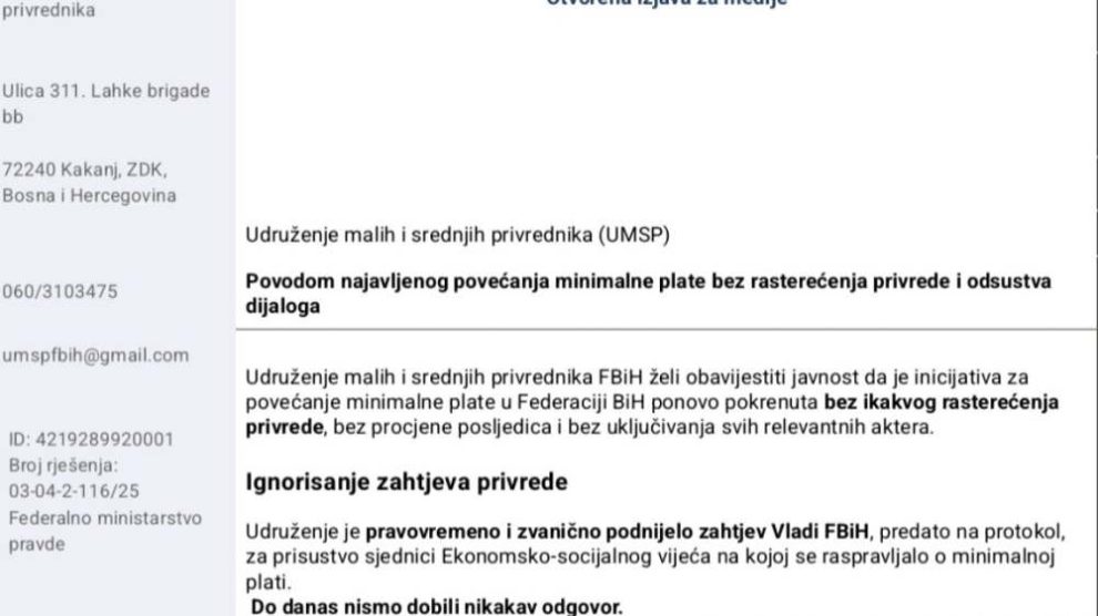 Udruženje malih i srednjih privrednika Federacije BiH saopćilo je da je inicijativa za povećanje minimalne plate u FBiH ponovo pokrenuta bez ikakvog rasterećenja privrede, bez procjene posljedica i bez uključivanja svih relevantnih aktera.