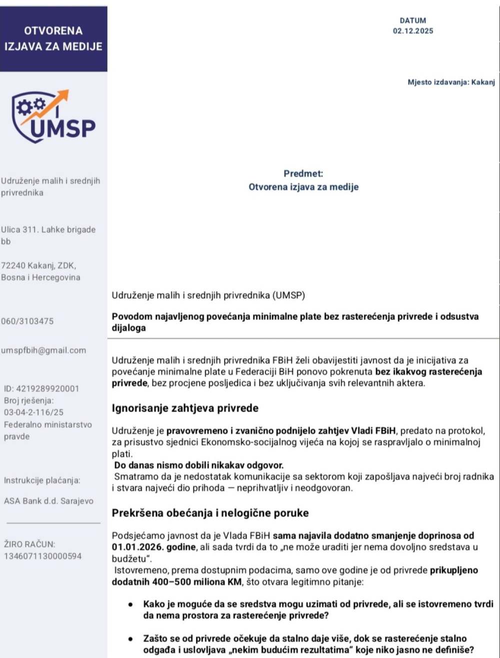 “Privreda je spremna na razgovor, ali neće više šutjeti dok se odluke koje utiču na sudbinu hiljada radnih mjesta donose iza zatvorenih vrata”, zaključuju iz Udruženja malih i srednjih privrednika Federacije BiH.