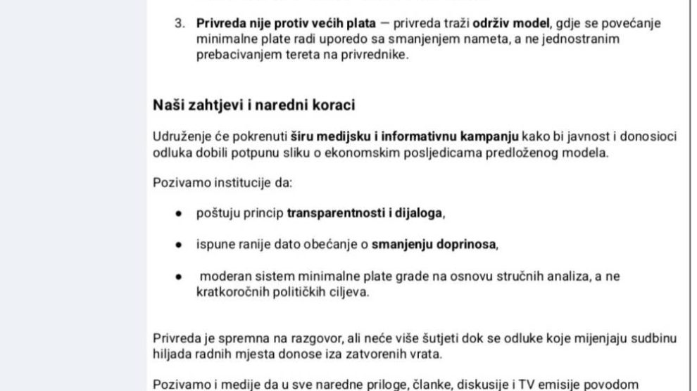 Pozvali su institucije da poštuju princip transparentnosti i dijaloga, ispune ranije dato obećanje o smanjenju doprinosa i da sistem minimalne plate grade na osnovu stručnih analiza, a ne kratkoročnih političkih ciljeva.