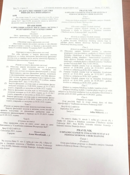 Pravilnik o fiskalnim sistemima, kojim je bila predviđena obaveza da privrednici moraju nabaviti nove fiskalne uređaje, u oktobru 2020. godine nije prošao Predstavnički dom Parlamenta FBiH, ali je ipak prije nekoliko dana on objavljen u Službenim novinama.