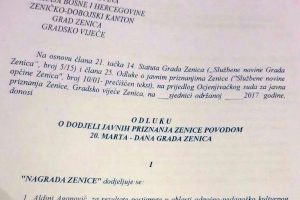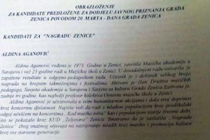 Priznanje Grada za Aganović je priznanje za opredjeljenje Snage Centra da okupi mlade i sposobne Zeničane – Ocjenjivački sud za javna priznanja Zenice je donio Odluku, a vijećnici Gradskog vijeća jednoglasno izglasali da se jedno od ovogodišnjih javnih priznanja Zenice, povodom 20. marta, Dana Grada Zenica dodjeli i Aldini Aganović, profesorici muzike iz Zenice.
