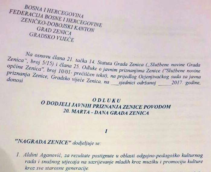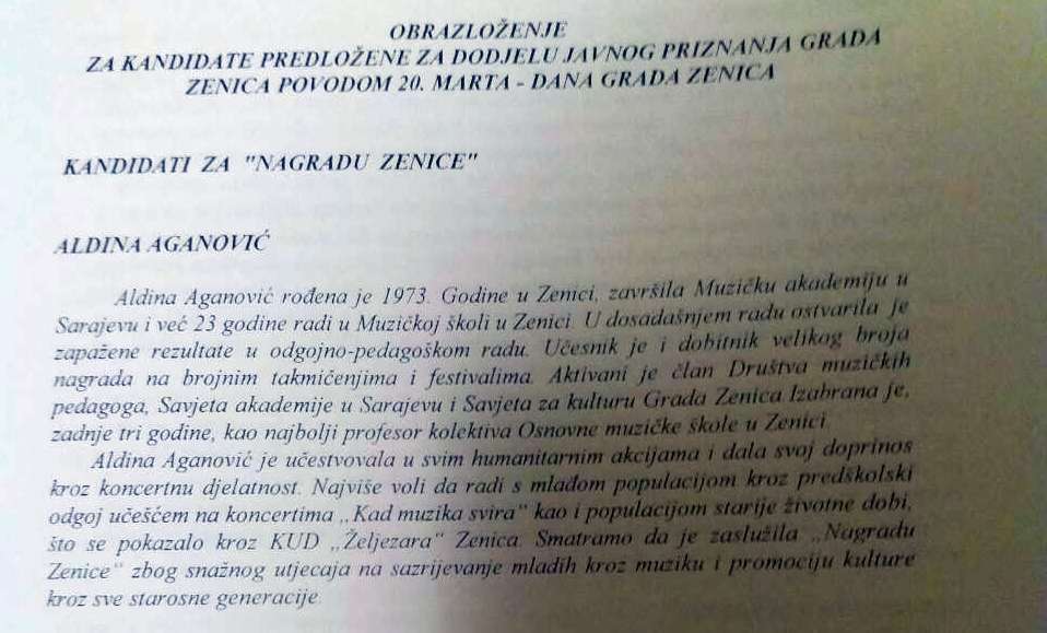 Priznanje Grada za Aganović je priznanje za opredjeljenje Snage Centra da okupi mlade i sposobne Zeničane – Ocjenjivački sud za javna priznanja Zenice je donio Odluku, a vijećnici Gradskog vijeća jednoglasno izglasali da se jedno od ovogodišnjih javnih priznanja Zenice, povodom 20. marta, Dana Grada Zenica dodjeli i Aldini Aganović, profesorici muzike iz Zenice.
