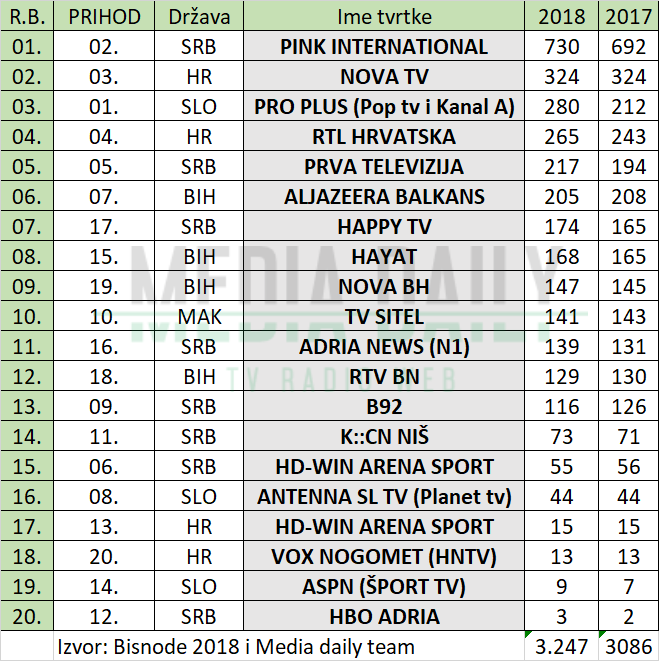 20 najvećih povećalo je broj zaposlenih za 161 osobu u odnosu na 2017. godinu. Najveći poslodavac Balkana je Pink koji ima 730 zaposlenih, druga je Nova sa 324, a treći PRO PLUS sa 280 ljudi. Najmanji broj zaposlenika imaju kablovske televizije HBO ADRIA i ŠPORT TV.