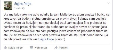 Pročitajte emotivnu poruku naše malene sugrađanke Sajjre Poljo – Bez ikakvih dodatnih komentara prenosimo, uz dozvolu porodice Poljo, poruku koju je naša malena sugrađanka Sajjra napisala večeras na FB – Podsjetimo, početkom prošle godine Sajjra je stradala nadomak kućnog praga, ostala nepokretna, prikovana za kolica, a sudskim procesom, okončanim nepravomoćno prije nekoliko dana, vozač počinilac saobraćajke, je osuđen na dvije godine zatvora.