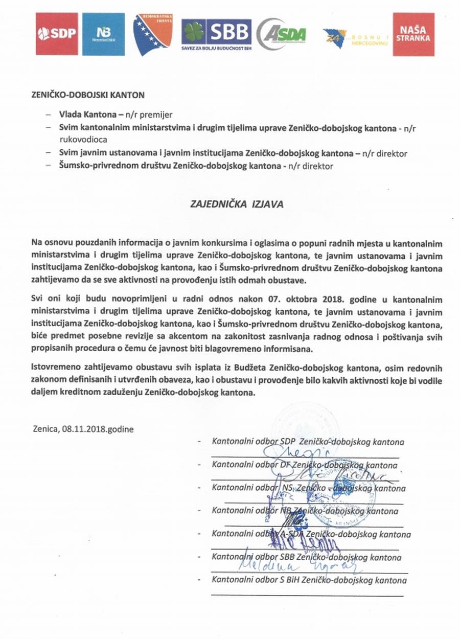 Pročitajte tekst Zajedničke izjave i Zajedničkih principa i okvira djelovanja skupštinske većine SDP/DF/NS/NB/SBB/A-SDA/S BiHprezentirani su Zajednički principi i okvir djelovanja skupštinske većine SDP/DF/NS/NB/SBB/A-SDA/S BiH u Zeničko-dobojskom kantonu za mandatni period 2018.-2022.”.
