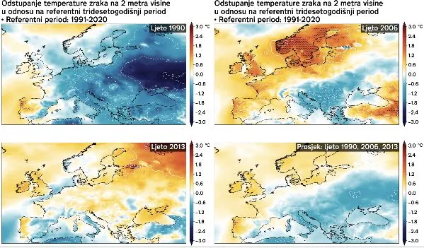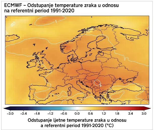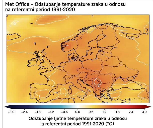 - Toplije ljeto u odnosu na referentni period 1991-2020, ali umjerenije u odnosu na 2024. godinu. Ljeto slično onom iz 2006. i 2013. godine.