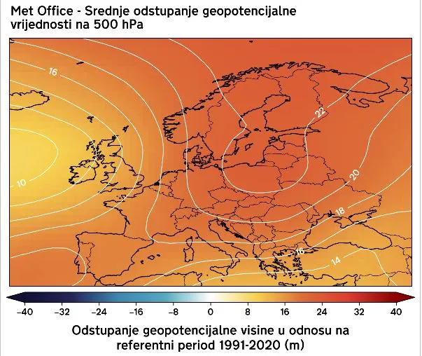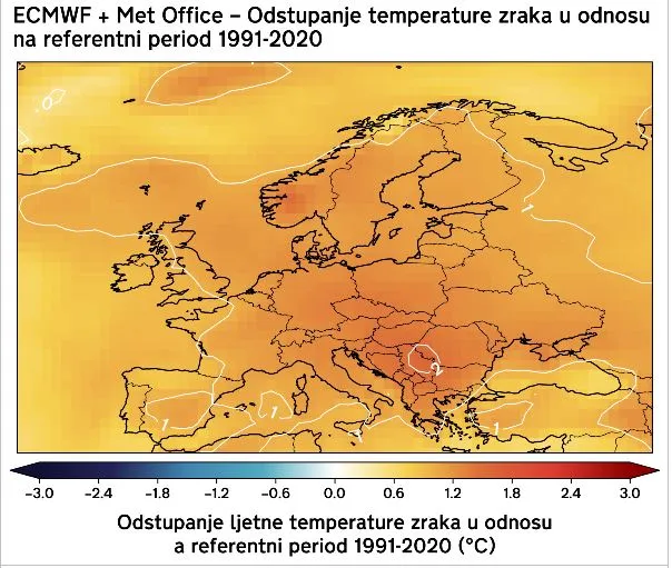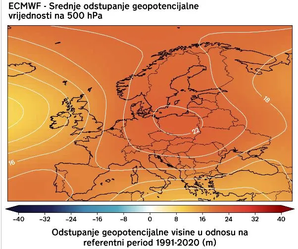 U skladu sa izraženijim pritisnim anomalijama, također uočavamo i da je veći dio kontinenta topliji od uobičajenog referentnog prosjeka, pri čemu se ističu centralni dijelovi Europe. Ovo upućuje da su toplotni valovi ovog ljeta izgledni u većem dijelu kontinenta.