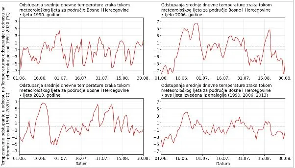 Ono što uočavamo jeste drugačija slika u odnosu na proteklih par ljeta, i tu dolazimo do prvog neslaganja sa našim analogijama, naročito s 1990. godinom. Ono što je evidentno jeste da se naslanja na srednje stanje atmosfere iz prethodne sezone, što se oslikava kroz topliji i sušniji sjeverozapad i sjever Europe, a vlažniji jugoistok, konzistentno sa stanjem koje trenutno imamo. Pomoću Pythonove biblioteke “regionmask”, koja će izvući obrise bosanskohercegovačkih granica i interpolirati podatke, uzet ćemo srednja odstupanja dnevne temperature zraka za područje Bosne i Hercegovine za sva tri ljeta u odnosu na referentni period 1991-2020.