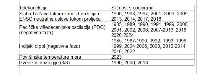 Na osnovu određenih telekonekcija prikazanih u tabeli (koje zahtijevaju posebno I podrobnije objašnjenje), sastavljena je iduća lista godina u kojoj smo imali slične uslove, a u opticaj uzimali smo događaje iz prošlosti (analogije) počevši od 1985. godine, a zaključno sa prošlom, 2024. godinom. Izbor godina prije 1980-ih zahtijevalo bi primjenjivanje linearnog/logaritamskog trenda kako bi se mogao ispratiti sadašnji klimatski trend. Na osnovu izvedenih godina smo rekonstruisali prvi set vizualnih materijala.