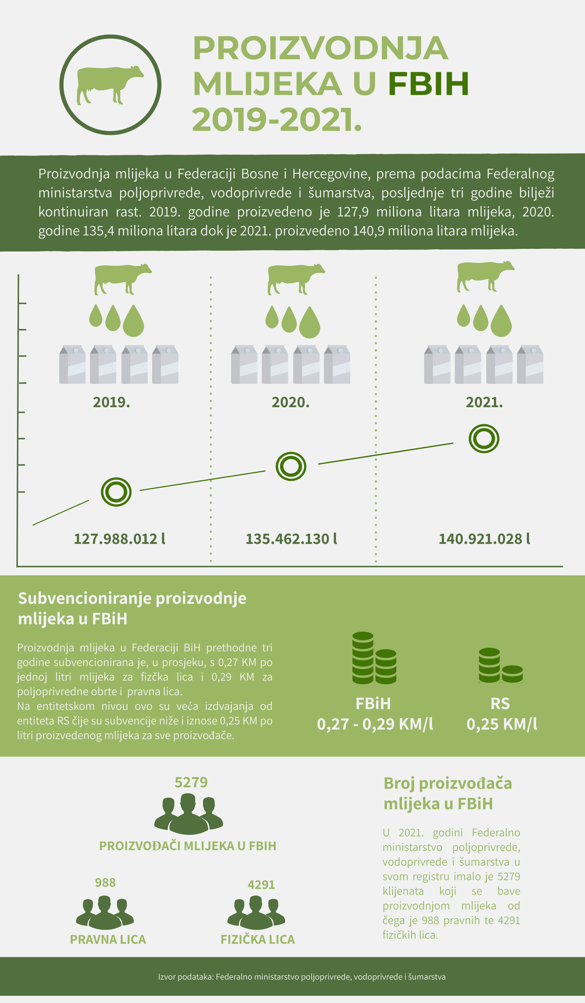 Iz Federalnog ministarstva poljoprivrede, vodoprivrede i šumarstva saopćeno je da se prema podacima iz Registra poljoprivrednih gazdinstava bilježi rast proizvodnje mlijeka u Federaciji BiH u posljednje tri godine. Tako je u 2019. godini proizvedeno 127,9 miliona litara, 2020. godine 135,4 miliona litara, a 2021. godine 140,9 miliona litara mlijeka