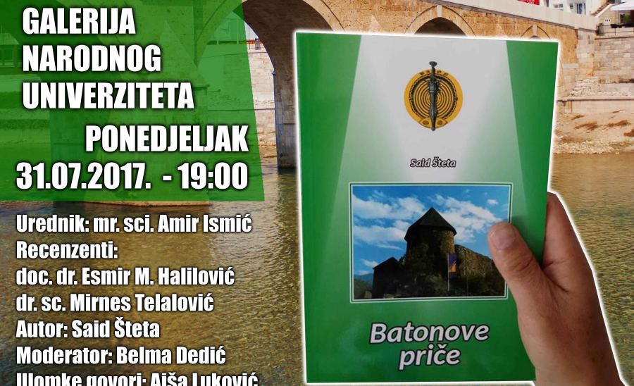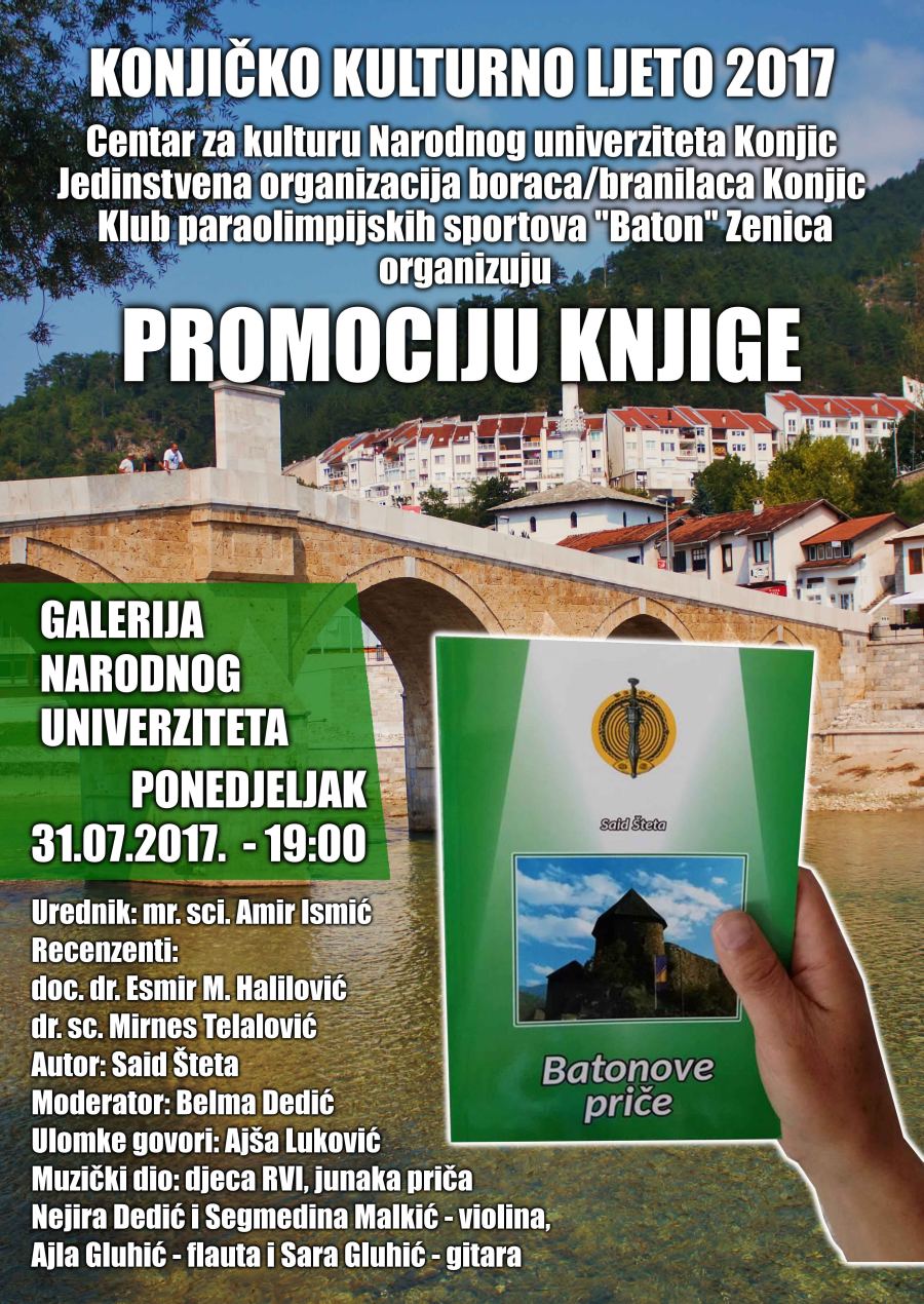 Promocija “Batonovih priča” u Konjicu 31. jula u galeriji NU – Na poziv Centra za kulturu Narodnog univerziteta Konjic i Jedinstvene organizacije boraca/branilaca Konjic, klub paraolimpijskih sportova “Baton” je sa posebnim zadovoljstvom prihvatio da u Konjicu promoviše knjigu “Batonove priče” čiji je autor naš sugrađanin, književnik i novinar Said Šteta, inače rođeni Konjičanin.