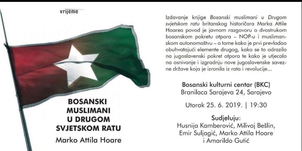 U Bosanskom kulturnom centru (BKC) u Sarajevu, u utorak 25. juna 2019. u 19:30 sati bit će održana promocija bh. izdanja knjige Bosanski muslimani u Drugom svjetskom ratu uglednog britanskog historičara i vanrednog profesora na SSST Univerzitetu u Sarajevu Marka Attile Hoarea.