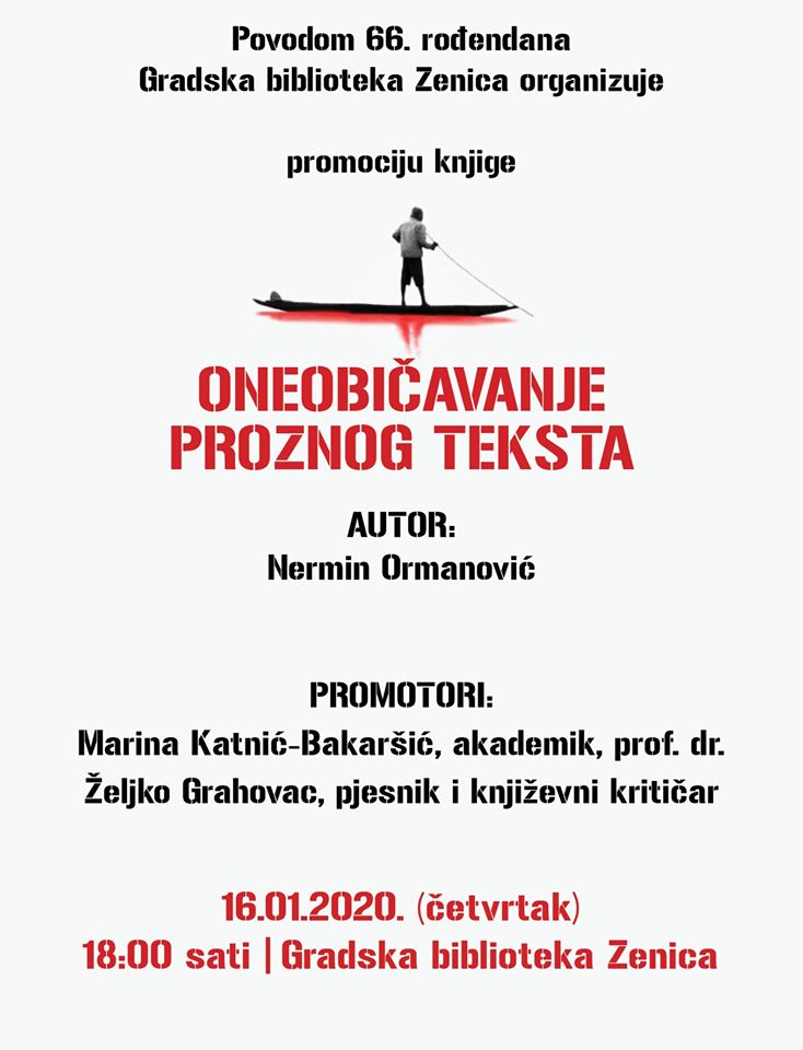 Promocija knjige “Oneobičavanje proznog teksta” povodom 66 godina Gradske biblioteke Zenica – U četvrtak, 16. januara 2020. godine u 18,00 sati, povodom 66. godišnjice Gradske biblioteke Zenica, organizujemo promociju našeg novog izdanja – knjige našeg kolege, doktoranta Nermina Ormanovića “Oneobičavanje proznog teksta”.