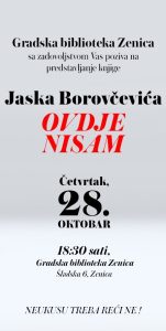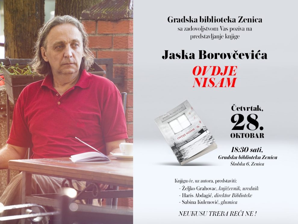 U četvrtak, 28. oktobra 2021. godine, sa početkom u 1830 u prostorijama Gradske biblioteke Zenica održat će se promocija zbirke poezije „Ovdje nisam“, autora Jaska Borovčevića.