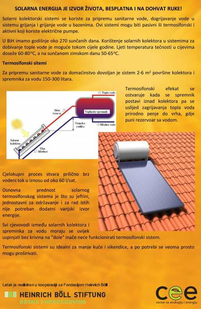 Javnu promociju solarnih sistema, koja je dio projekta „Korištenjem energije sunca do pozitivnih klimatskih promjena“ Centar za ekologiju i energiju realizuje u kooperaciji sa Fondacijom Heinrich Böll i u saradnji sa Udruženjem Eko Forum iz Zenice.