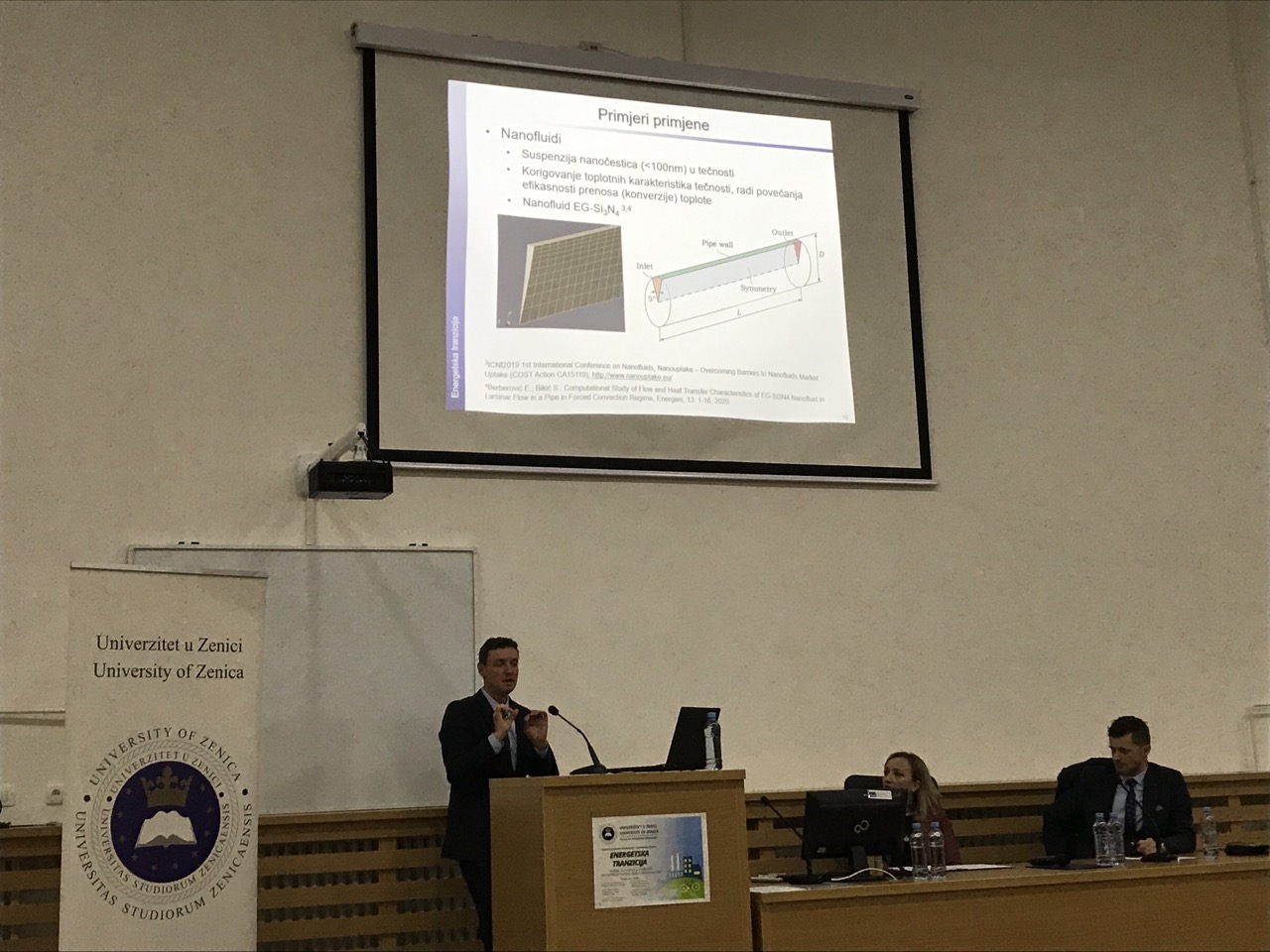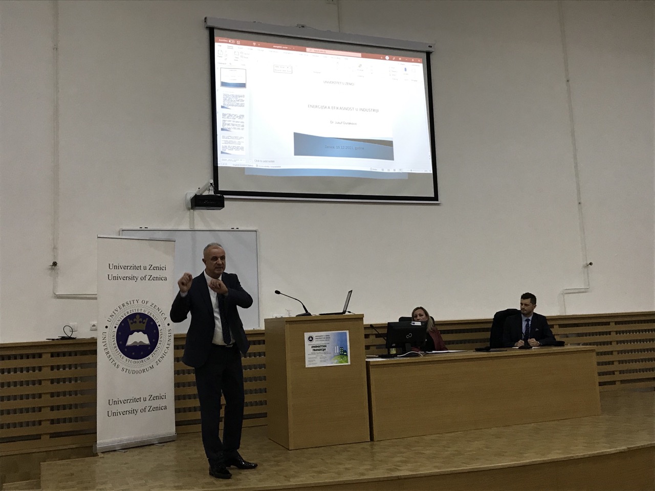 Nakon toga su uslijedila predavanja. Budući, da pored javnih poslova, Centar za energetsku efikasnost treba da bude servis privredi i industriji, gdje je sam Univerzitet odavno prisutan i ima značajne rezultate i patente u oblasti energijske efikasnosti, ponajprije kroz praktični rad i konkretne projekte koje je vodio r. prof.dr. Jusuf Duraković. Profesor Duraković je redovni profesor iz oblasti toplotehnike na Metalurško-tehnološkom fakultetu Univerziteta u Zenici. Objavio je preko 30 radova, uradio je na desetine projekata i posjeduje vlastite patente. Stoga je rektor Univerziteta u Zenici r. prof. dr. Jusuf Duraković održao prvo predavanje na temu Energijska efikasnost u industriji.