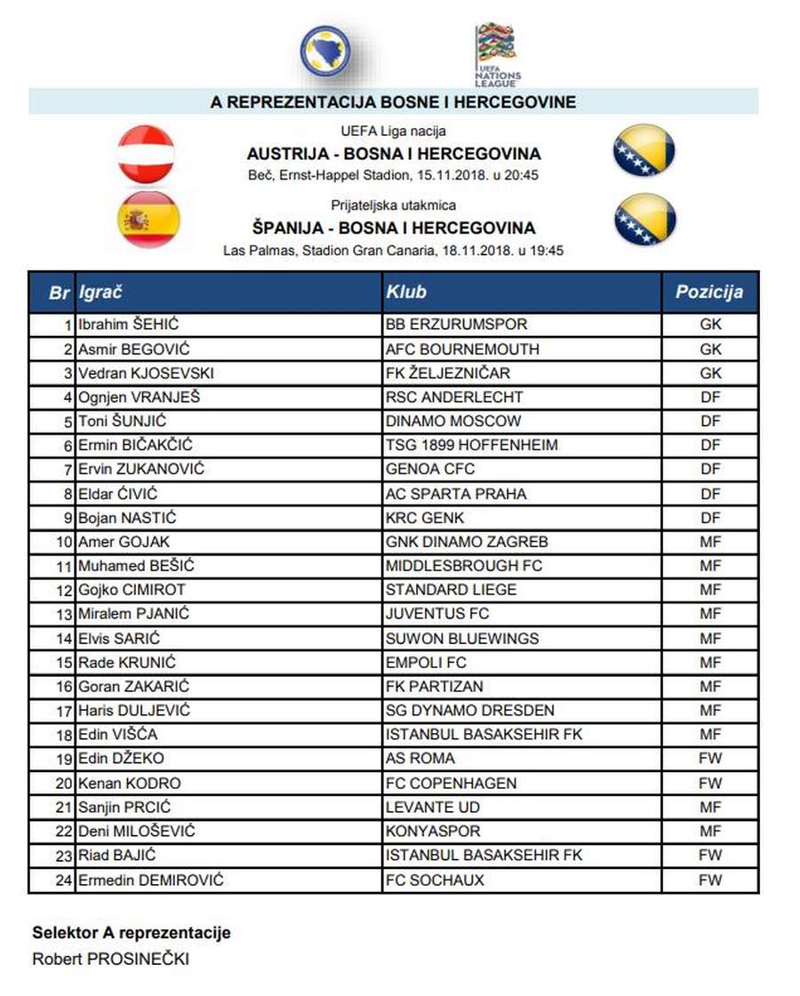 Prosinečki objavio spisak za Austriju i Španiju – Selektor „A“ reprezentacije Bosne i Hercegovine Robert Prosinečki je danas u hotelu „Europe“ u Sarajevu saopštio spisak igrača na koje računa za utakmice sa Austrijom i Španijom.